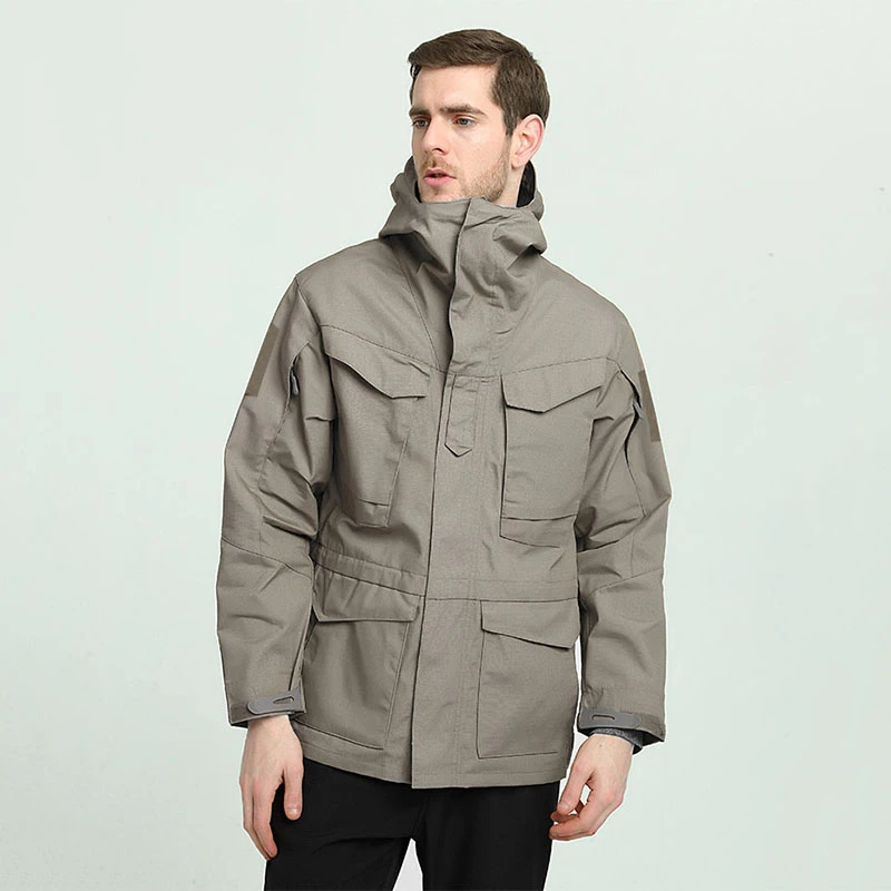 Tear resistant jacket. It is made of durable fabric that will hold up to constant wear and tear. Winter jackets are typically water resistant and insulated. The Mars Jacket and Pants set is available in gray and cream colors.